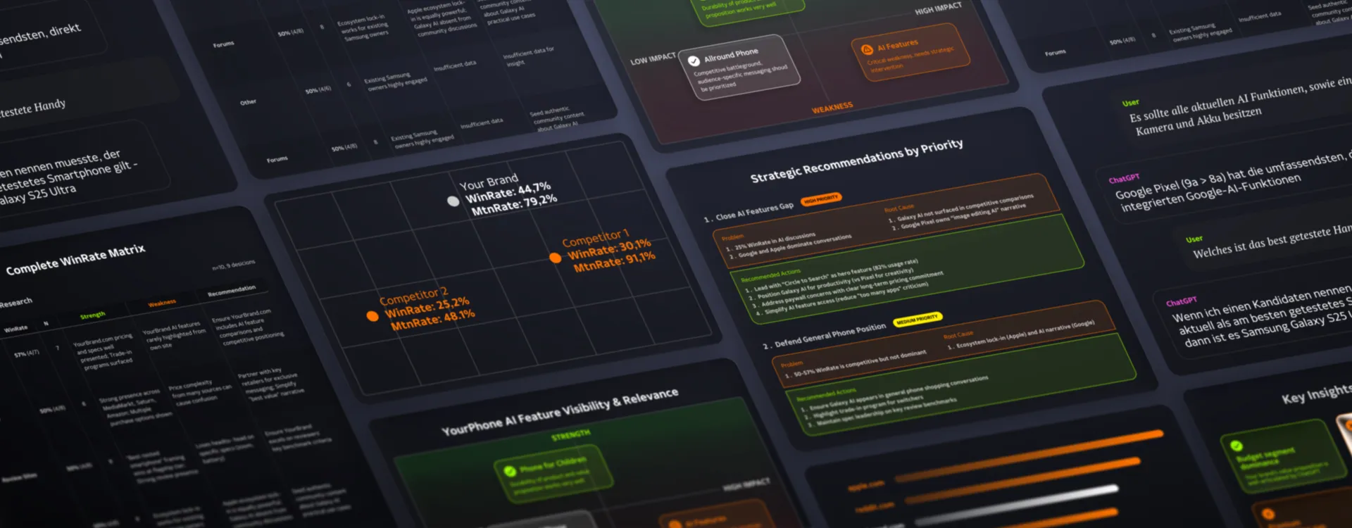 Die KI-Suche beschleunigt Verschiebungen in abgesteckten Märkten. Neue Features, neue „Kaufgründe“ oder neue Anbieter können sich in Konversationen schnell etablieren. Und das oft, bevor klassische Reports das zeigen. Durch unser fortlaufendes Monitoring erkennen wir früh, welche neuen Narrative entstehen, wie sich das Framing verändert und wo Wettbewerber Momentum aufbauen.